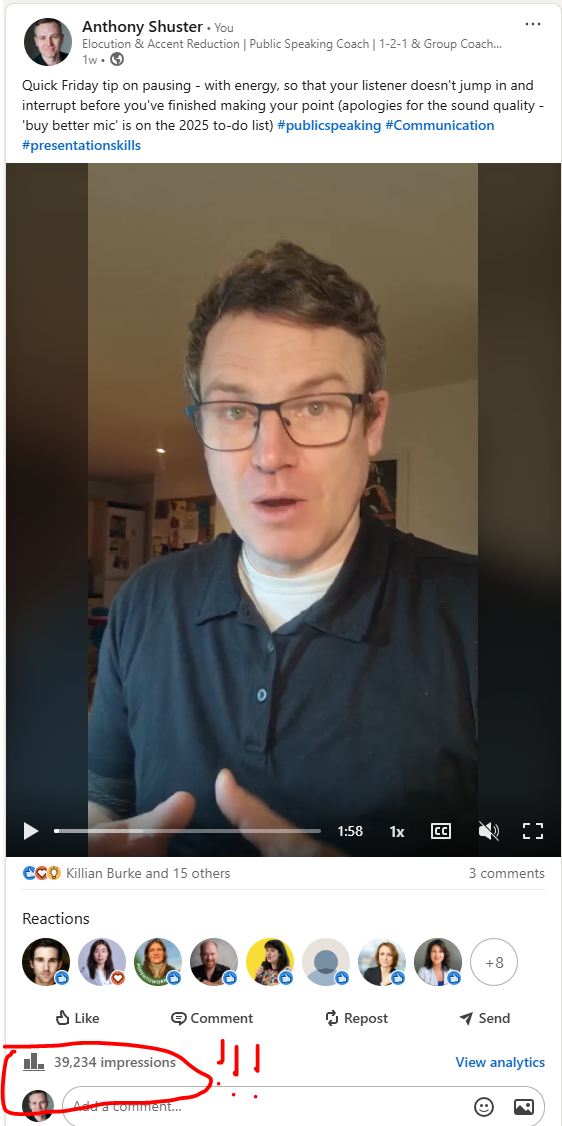 I posted a video on LinkedIn the other week, that's been going kind of viral: it's about how to pause, with energy, so that listeners don't take your pause as their cue to jump in and interrupt you.