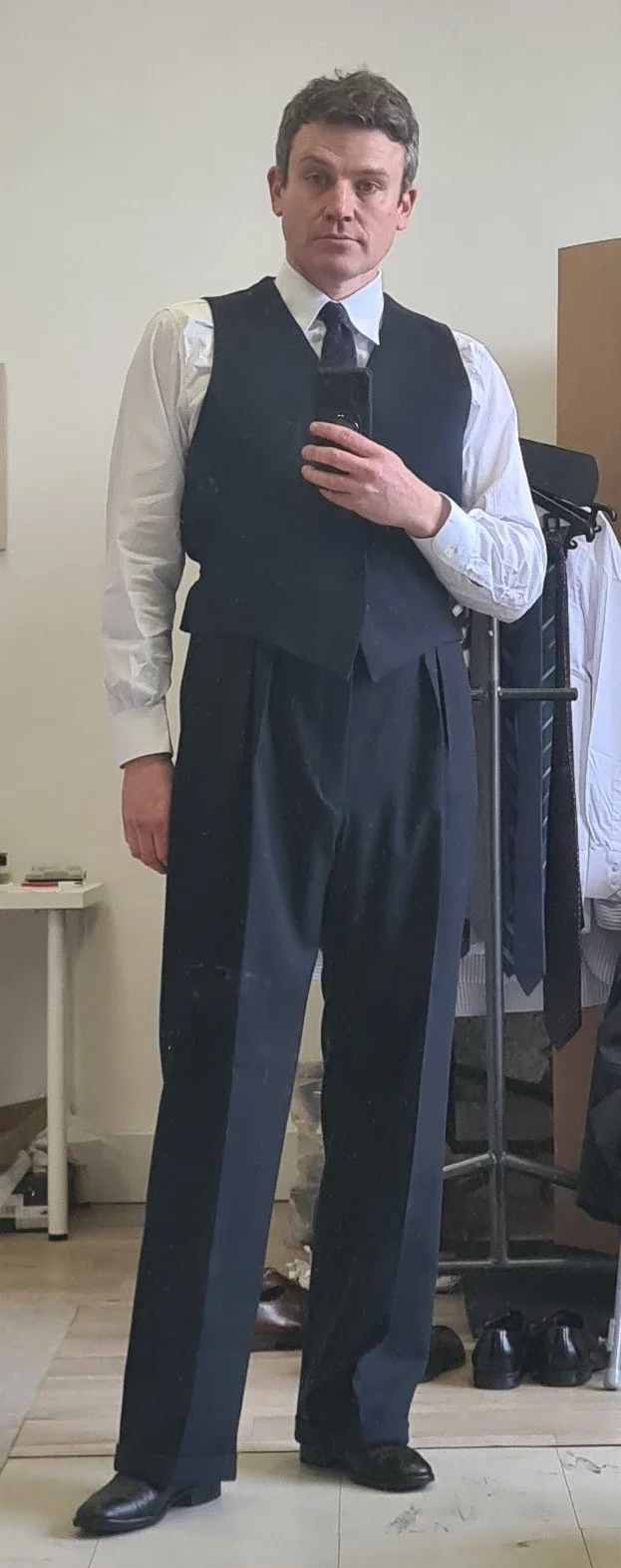 Looking the part: at a costume fitting in Paris, and I’ve never looked more English
